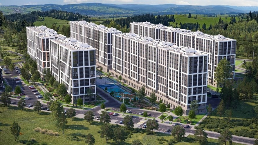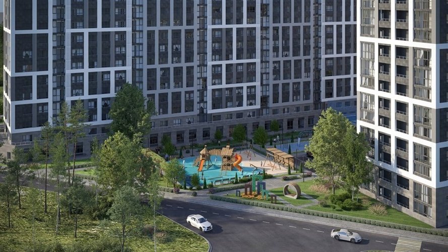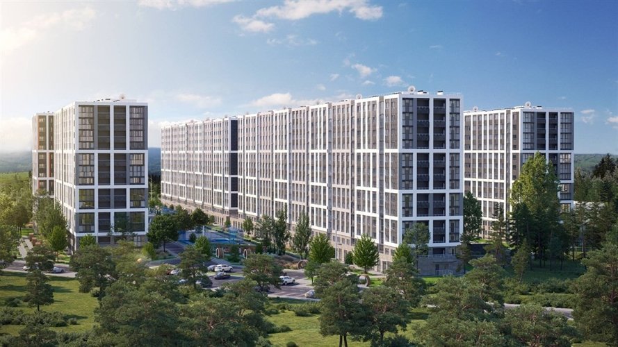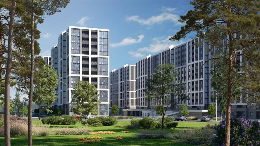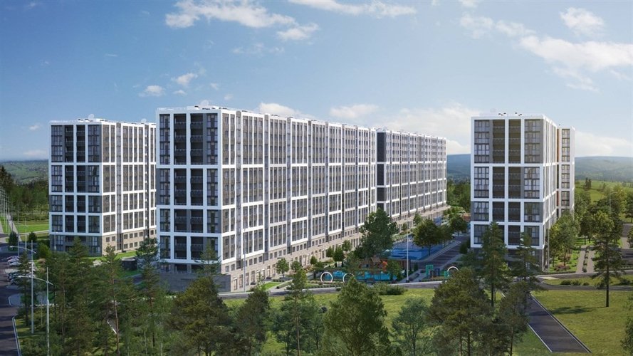 Восемь 13-ти этажных домов, гармонично вписываются в природный ландшафт.Фасады украшены качественными материалами: вентилируемые панели, керамогранит и